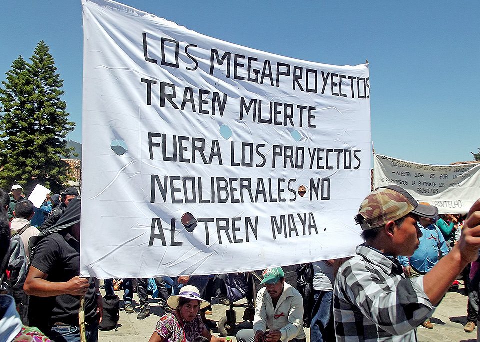 El llamado proyecto “Tren Maya” busca transportar de 600,000 a 800,000 nuevos turistas al año en la península de Yucatán. En “consultas” engañosas y autoritarias, el gobierno simula informar y consultar con las poblaciones locales sobre los efectos del proyecto, alegando que es un proyecto de “desarrollo” que traerá beneficios a los pobres e indígenas de la zona: empleos, modernos, infraestructura, oportunidades de negocios.