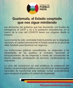 Otra expresión fue el toque de queda, y este toque de queda, mira, para mi fue una expresión de un golpe muy fuerte a mi pueblo porque mi pueblo ha sufrido también de ataques. Y mi pueblo k‘iche’ ha sido un pueblo que ha sido muy perseguido por los militares y los paramilitares, los kaibiles, y esto para nostras también es una expresión de un ataque perverso contra el movimiento revolucionario en K‘iche’ . Esas fueron expresiones tamién que se dieron, aumentó el racismo contra los pueblos, se despidió en muchas empresas personas de forma injustificada, aprovechándose de esta situación pandémica hubo mucha expresión de despido. Y el sistema de salud también cayó en crisis trágica porque eso ya estaba, y lo peor fueque esa espresión de golpe de estado o toque de queda fue sólo para los pueblos porque las grandes empresas mineras, hidroeléctricas, monocultivos, petroleras continuaron funcionando y saqueando los territorios.
