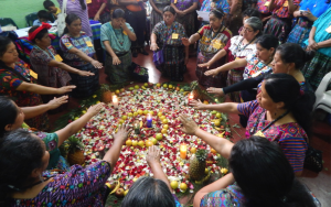 Lolita: Mira, como hay territorios de Guatemala en donde estamos sin estado, o sea, donde no llega la gestión del estado. Guatemala por ser racista, en las comunidades internas sí, pero ya a nivel nacional ha habido una expresión peyorativa, racista y de exclusión, pero también de marginación y de ensañamiento, como de criminilización. Las guías espirituales, las ajiom que decimos y ajq’ij han sido también perseguidas, nosotras hemos sido perseguidas desde las expresiones de esta nación. Por eso las abuelas nos llaman a cuidarnos bastante para que no seamos expuestas a expresiones de ataques. Las empresas farmacéuticas son las que principalmente nos persiguen porque nuestra sanación está bastante vinculada no solo al Cosmo-ser sino que también a la autocuración y la sanación a través de plantas medicinales y a través de terapias que se dan en las propias comunidades. Terapias ancestrales que no necesitan dinero de por medio, sino más es una expresión de reciprocidad en la red de la vida entre comunidades. Por ejemplo, hay guías espirituales que están dentro de territorio y se van a otros territorios, y luego las otras sanadoras van a otro territorio, es como trueque o algo así, sin que pase el dinero de por medio. Esto no les conviene a las farmacéuticas, porque tampoco usamos medicina occidental sino usamos las plantas y nosotras lo llevamos en nuestro ser.
