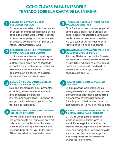 De este modo, El TCE está siendo utilizado ─y lo será cada vez más─ para cuestionar aquellas medidas legislativas dirigidas a eliminar progresivamente las fuentes de energía fósil y nuclear. Será un obstáculo para priorizar la inversión en energías renovables y en eficiencia energética, para poner la producción de energía bajo el control público y para adoptar medidas que pongan fin a la pobreza energética.