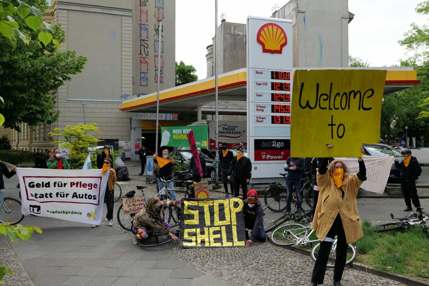 El día de la AGM de Shell, que se llevó a cabo a puerta cerrada con sólo 2 accionistas presentes (aparentemente no han oído hablar del zoom), grupos de toda Europa tomaron medidas, con protestas a distancia física, alteraciones en las gasolineras, graffitis creativos, baci-manifestacioneso y acciones online. Aquí más ejemplos!
