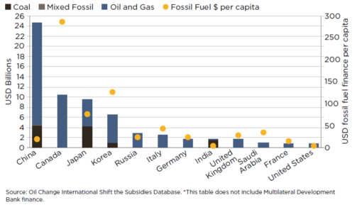 La siguiente figura del informe muestra los 12 principales países del G20 por su financiación anual de combustibles fósiles, con la gran mayoría destinada al petróleo y el gas. Mientras los gobiernos del G20 preparan niveles históricos de financiación pública para el estímulo de COVID-19, el compromiso de eliminar gradualmente la financiación de los combustibles fósiles debe sustentar una recuperación justa. Lea más en AFP y en el blog de OCI.