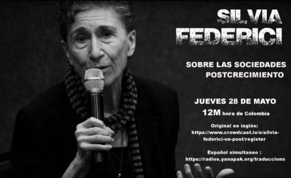 La teórica y feminista marxista Silvia Federici compartió sus ideas sobre el actual momento en un seminario web correspondiente a un proyecto de investigación sobre sociedades de postcrecimiento, adscrito al Centro de Investigación sobre Innovaciones y Transformaciones Sociales de la Escuela de Innovación Social Elisabeth-Bruyere de la Universidad de Saint Paul, en Ottawa (Canadá). Colombia Informa publica una traducción al español editada de este seminario* que exploró formas de construir una sociedad más allá del crecimiento, del capitalismo, del colonialismo y del patriarcado.