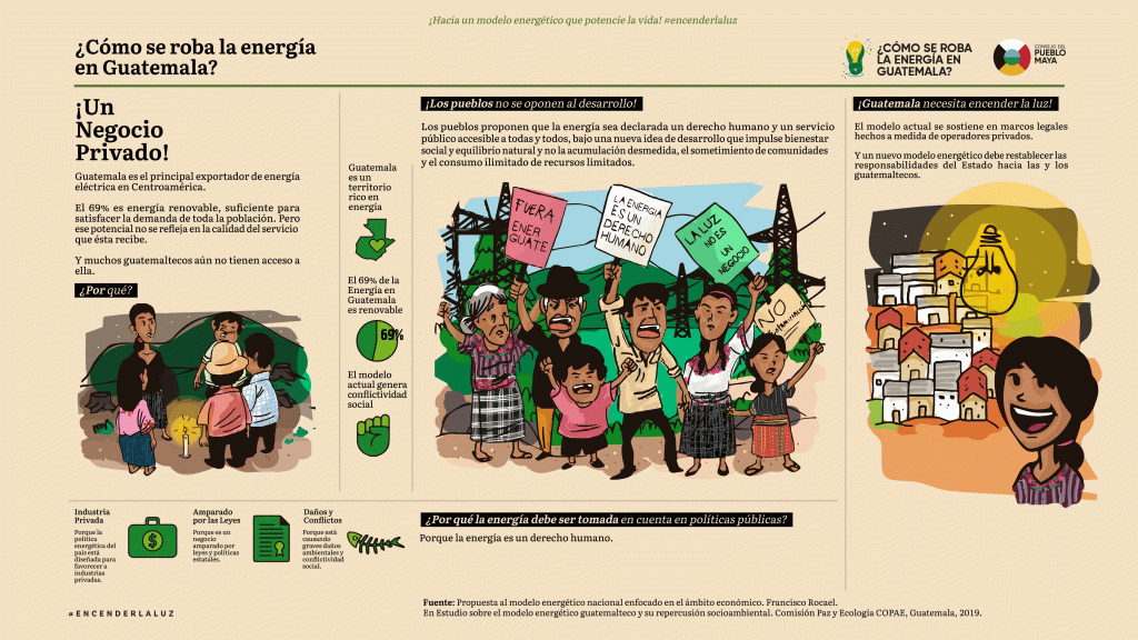 El actual modelo energético de despojo se sostiene en un marco legal e institucional hecho a la medida de operadores privados. Los pueblos proponen que la energía sea declarada un derecho humano y un servicio accesible a todas y todos. Porque un nuevo modelo energético debe restablecer las responsabilidades del Estado hacia los guatemaltecos.