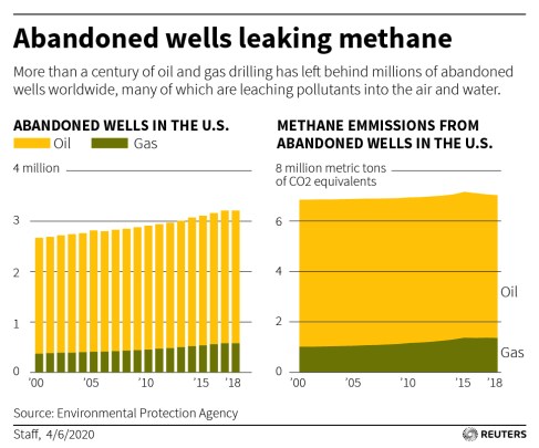 Los investigadores dicen que es imposible estimar con precisión las emisiones globales de los pozos abandonados con fugas sin mejores datos. Pero un cálculo aproximado de Reuters, basado en la cuota de producción de crudo y gas natural de los Estados Unidos, situaría el número de pozos abandonados en todo el mundo en más de 29 millones, con emisiones de 2,5 millones de toneladas de metano al año, el equivalente al daño climático de tres semanas de consumo de petróleo en los Estados Unidos.