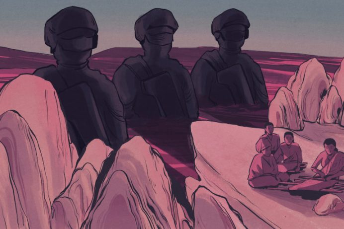Para octubre, los mineros habían llegado a la roca. Para entonces, unas 100 mujeres se habían reunido en el lugar, enfrentándose cara a cara con los trabajadores y las fuerzas de seguridad. Cada día llegaban a las 4 de la mañana, recordaba Lodia, corriendo para llegar antes que los mineros y quedarse hasta la noche. «Teníamos que darnos prisa y llegar antes que esos matones», me dice. «Ellos nunca retrocederían, pero nosotros tampoco».