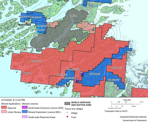 En diciembre de 2018, el Ministro de Recursos Minerales y Trabajo fue preguntado por un miembro del Parlamento si el gobierno llevaría a cabo una Evaluación de Impacto Patrimonial (EIP) del proyecto minero de Kvanefjeld y no tomaría una decisión sobre la concesión de la licencia del proyecto, antes de que se hubiera presentado a la UNESCO para una evaluación.