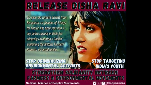 Disha Ravi debe ser puesta en libertad inmediatamente retirando todos los cargos presentados contra ella. También deben retirarse las órdenes de detención contra Shantanu Muluk y Nikita Jacob, y no deben tomarse más medidas contra los jóvenes que han estado apoyando el movimiento campesino y las causas de justicia social y medioambiental.