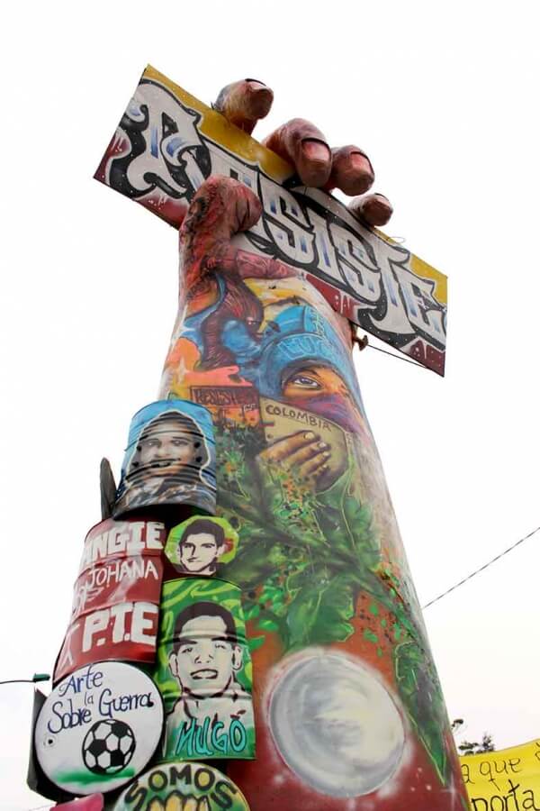 La escultura de 12 metros de altura recibió también unos 6 millones de pesos que fueron recolectados para los materiales y quienes lo edificaron lo hicieron de manera voluntaria durante más de tres semanas. La mano principal del monumento fue pintada con rostros de las víctimas del abuso policial en las manifestaciones, la guardia indígena, algunos participantes y la frase “¿Por qué nos matan?” así como la aterradora cifra de 6.402 víctimas de ejecuciones extrajudiciales o “falsos positivos”.