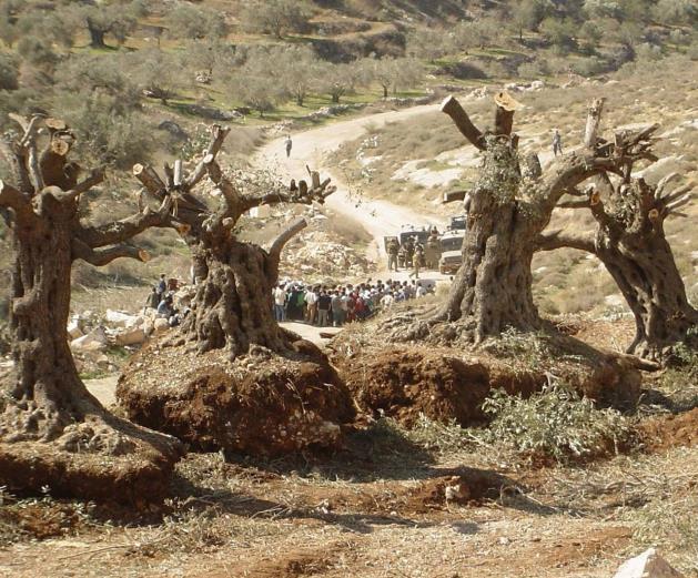 - Los ataques de los colonos a las propiedades palestinas, que incluyen, entre otras cosas, la quema de árboles.