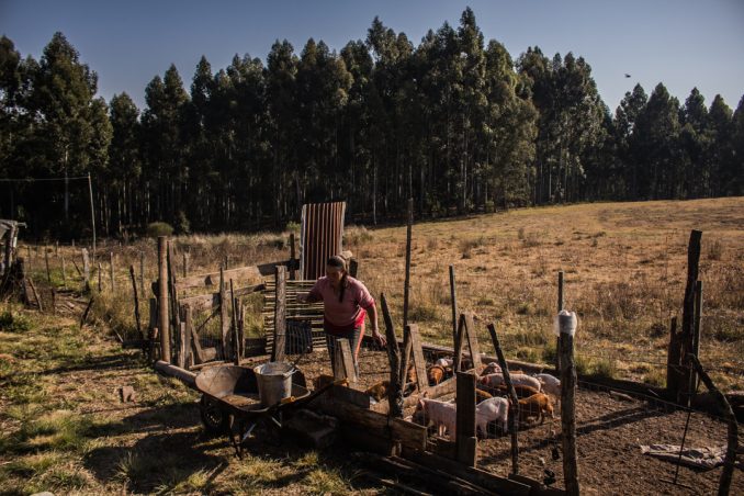 Son las 10 de la mañana y el patrón ordena vacunar a sus lechones nacidos hace pocos días. Claudia deja las mudas y busca las jeringas. Va hacia el fondo, donde su sobrino Diogo la espera con un cerdito a upa, y se para frente a los inmensos eucaliptos. “Antes podíamos ver todo hasta allá, hasta la siguiente casa, que está a diez kilómetros”, dice dibujando con la palma derecha una línea en el horizonte.