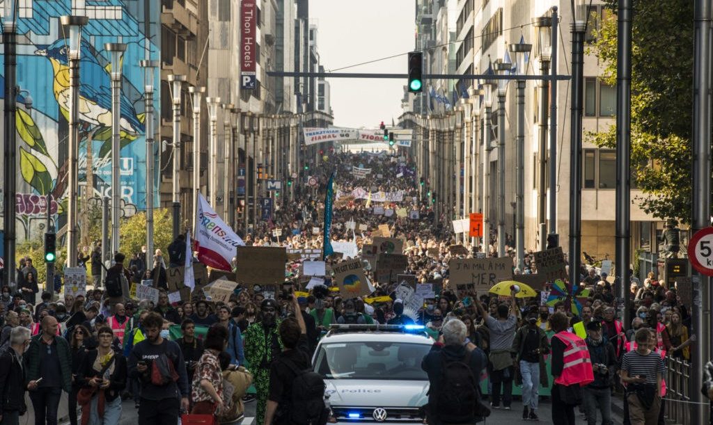 Cerca de 30.000 manifestantes irrumpieron en el centro de Bruselas el 10 de octubre contra el cambio climático, en una protesta que siguió a las dramáticas