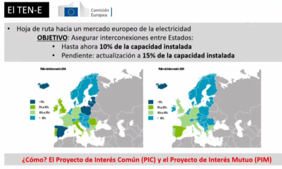 Finalmente, el TEN-E es el plan europeo de la red de transporte entre estados. Se busca hacer un mercado único de electricidad a través de interconexiones. Antes se pedía que cada país tuviera una capacidad de interconexión del 10%, lo cual para España por razones geográficas de ser una península y tener una cordillera con Francia es demasiado. Pero además se va a aprobar una regulación de que se llegue al 15% de interconexión…