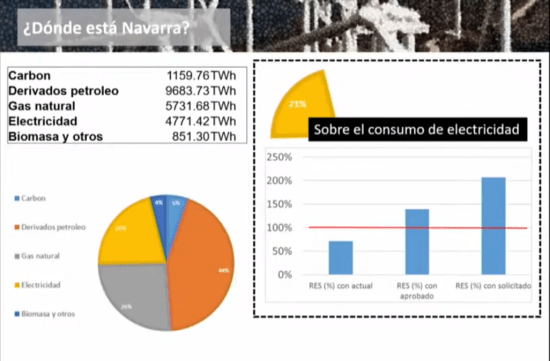 A nivel de consumo, la electricidad es solo el 21% de la energía total consumida, y la electricidad renovable viene a ser ahora el 70% de la electricidad consumida en Navarra. Con las instalaciones renovables que ya están aprobadas se generaría un 140% del consumo eléctrico actual de Navarra, y con lo que se están estudiando, con la capacidad de las subestaciones, se llegaría al 200% del consumo eléctrico actual de Navarra. Osea, se duplican las necesidades de Navarra. (Pero esos cálculos no incluyen la cantidad de energía fósil que consume Navarra actualmente, y que es necesario eliminar y pasar a renovable. Nota de Sustrai Erakuntza.)