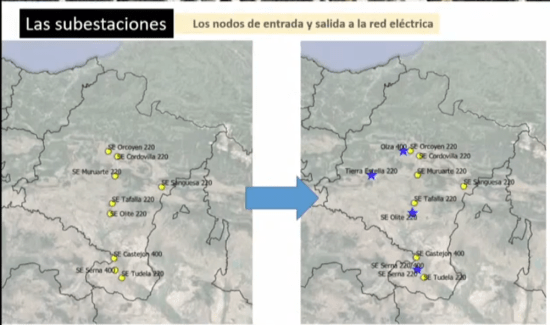 Las energías fósiles son muy gestionarles y tienen alta densidad energética. Por eso el modelo energético es unidireccional, con una gran concentración en la geografía de las fuentes de electricidad, y los consumidores distribuidos por el territorio y que no podemos opinar ni hacer nada. Así, el sistema eléctrico tiene grandes centrales de producción centralizada. una red de transporte de electricidad y las zonas de consumidores. Y hay nodos donde confluye esa red que son las subestaciones, en Navarra por ejemplo: Cordovilla, Orkoien, Muruarte, Olite, Sanguesa, Tudela…