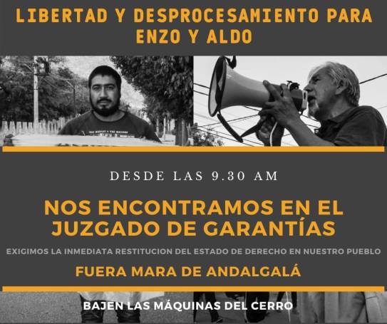 La jueza de control de garantías confirmó la detención de Enzo Brizuela. En una nota compartida por la Asamblea, el activista dice estar «determinado a continuar la huelga de hambre seca que inicié ayer al confirmarse mi detención, y la sostendré hasta que cese la persecución ideológica que pesa sobre mi y sobre mis compañeros de lucha. Hasta que me liberen no solo a mi, sino también a mi cerro, a nuestro cerro. Aquí no se rinde nadie! Sigo defendiendo la vida y el agua de mi pueblo!»