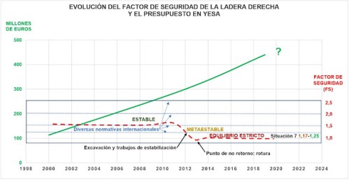Muy al contrario, como observamos en este gráfico recopilatorio (como el de arriba) que recoge la evolución media del Factor de Seguridad (FS) de informes realizados entre 2001 y 2021, las ampliaciones de los presupuestos (en millones de euros) que vinieron con las sucesivas modificaciones del proyecto, supusieron una merma en la seguridad, culminando en 2020 con la aceptación de someter a mayor riesgo y amenaza a la población (este paso importante se explica en este vídeo a partir del minuto 21′:30» o al final de este artículo en el mismo vídeo que lo cierra).