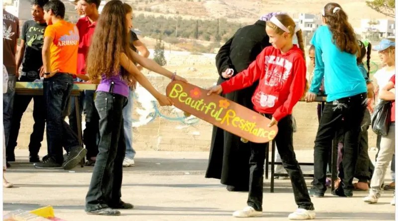 A pesar de estas dificultades, nuestra «Bella Resistencia» continúa. Con su especial compromiso con los niños, jóvenes y mujeres palestinos, Beautiful Resistance está haciendo un sincero intento de ayudarles a crear un nuevo futuro para ellos y su país. La idea convencional es que hay que explicar las cosas a niñas y niños, que hay que bajar a su nivel para que tengan sentido de un tema. Nosotros le hemos dado la vuelta a esa idea. Nuestra experiencia nos dice que niñas y niños están llenos de imaginación creativa, mucho más que las personas adultas. Niñas y niños pueden crear mundos que ningún adulto puede imaginar o entender. Pueden concebir y organizar juegos que a ningún adulto se le ocurren. Niñas y niños pueden obtener diversión de las cosas más simples, y pueden interpretar lo que ven o escuchan de formas impensables para los adultos. Por eso, Beautiful Resistance ha trabajado para subir al nivel de niñas y niños, y no para bajar. Hemos intentado aprovechar su creatividad y proporcionarles nuevas herramientas para su imaginación, de modo que puedan expresarse a través de las artes escénicas y visuales.