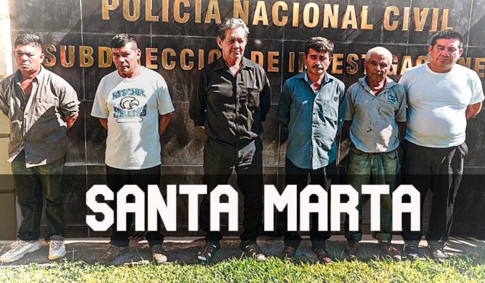 Miguel Ángel Gámez, Alejandro Laínez García, Pedro Antonio Rivas Laínez, Antonio Pacheco “Chico Montes” eta Saul Agustín Rivas Ortega dira atxilotuak, eta duela 33 urte baino gehiago armadaren ustezko informatzaile bat hiltzea leporatzen diete. Giza eta ingurumen eskubideen aldeko ekintzaileak dira guztiak. Antonio Pacheco Ekonomia eta Gizarte Garapenerako Elkarteko (ADES ) zuzendaria da, eta elkarte horretako kide da Saul Agustín ere, meatzaritzaren legea onartzeko eragin handiena izan zuen erakundeetako bat.Santa Martako komunitatearen arabera, komunikatu baten bidez adierazi dutenez, «Santa Martako komunitatea eta ADES elkartea erasotzeko benetako helburua duen express kasu bat da, lidergoei eraso eginez».