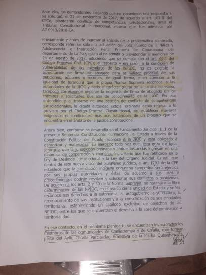 También la resolución 35 expresa de la misma manera oscura con argumentos falsos donde el juez pidió demuestren la Comunidad. Mario choque y Rene Ticona nunca pudieron demostrar sobre la comunidad. Entonces esa resolución dice lo mismo ch’alla y challapampa es del AYLLU CH’ALLA parcialidad aransaya demostrado ante el tribunal constitucional con documentos ancestrales , queda juzgada ,claro y concreto y ahora ellos deben reclamar a su propia gente que nos demandó , ahora al estado le toca hacer cumplir las sentencias constitucionales garantizar el cumplimiento.