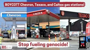 El Comité Nacional Palestino de BDS (BNC), la mayor coalición palestina que lidera el movimiento mundial de Boicot, Desinversión y Sanciones, ha hecho un llamamiento para intensificar la campaña contra el gigante de los combustibles fósiles Chevron por su papel en alimentar el genocidio y el apartheid israelíes en curso. El pueblo palestino pide a sus aliados que boicoteen las gasolineras Chevron, Texaco y Caltex en todo el mundo.