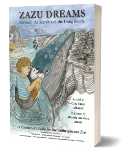 ¿Qué significa proteger a nuestros hijos? ¿Qué significa prepararlos? Zazu Dreams: Between the Scarab and the Dung Beetle, A Cautionary Fable for the Anthropocene Era (Sueños de Zazu: Entre el escarabajo y el escarabajo pelotero, una fábula con moraleja para la era del antropoceno), mi libro transcultural sobre la justicia climática, afirmo: «En el debate nacional sobre cómo proteger emocionalmente a nuestros hijos, muchos padres/madres de mentalidad ‘holística’ confunden las ‘noticias’ sobre terrorismo, brutalidad policial, tiroteos en las escuelas, etc. con la devastación ecológica, considerándolos todos temas tabú. En contra de esos temores, sugerimos a los padres y educadores que enseñen a los niños por qué los valores ecológicos y los comportamientos responsables son nutritivos y necesarios para reparar nuestro mundo (el principio judío tikkun olam)».