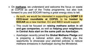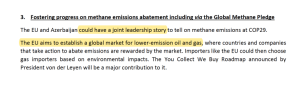 A finales de febrero de 2024, la Comisión Europea hizo una propuesta concreta de actividades conjuntas en la COP29. Además de ofrecer un Diálogo Ministerial sobre la triplicación del despliegue de energías renovables y la duplicación de la eficiencia energética (acordado en la COP28), que parecía formar parte de un esfuerzo más amplio para «reverdecer» la imagen de Azerbaiyán, sobre el metano los dos «podrían tener una historia de liderazgo conjunto que contar» durante las negociaciones y podrían «mostrar la cooperación y el progreso… en el marco del Compromiso Global sobre el Metano». En la propuesta, la UE afirmaba que la adhesión podría abrir nuevas oportunidades financieras para Azerbaiyán: «La UE aspira a establecer un mercado global para el petróleo y el gas con menos emisiones» en el que aquellos que tomen medidas «sean recompensados por el mercado» gracias a que los importadores como la UE elijan de quién importan «en función del impacto medioambiental» (ver imagen inferior).