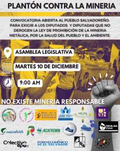 - Onartu egiten dugu meatzaritzaren aurkako borroka areagotzeko deia, biztanleriaren bizitza eta herrialdearen existentzia jokoan daudelako. «Biziraupen nazionalaren» eta «El Salvadorko gizarte osoaren salbazioaren» alde lerroak ixteko gonbidapena egitea egokia da meatzaritza saihesteko eta erauzketa-proiektu ilunak ahalbidetzen dituen lege berria indargabetzeko.