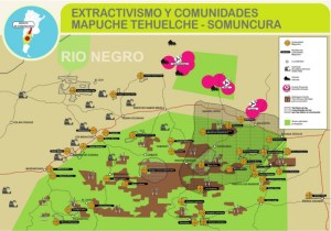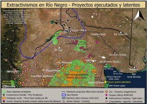Rio Negro probintzian uranio-meategiak ditugu ere: urrea eta zilarra; baso-industria ere gatazka da, lurra bereganatu dutelako. Hemen ere 180 baino komunitate gehiago daude. Mapa honek erakusten du lurraldea nola ari den gertatzen zenbait komunitaterekin lotutako gatazka horiek. 2 milioi 200 mila hektareako eremua da, eremu babestua, Somuncurako goi-ordokia, non hidrogeno berdea ekoizteko proiektu bat egon zen, Australiako enpresa baten parke eolikoak jartzeko, Fortescue Future Industries (FFI) enpresari, zeinek 625 mila hektarea eman baitzizkioten 80 urtean.