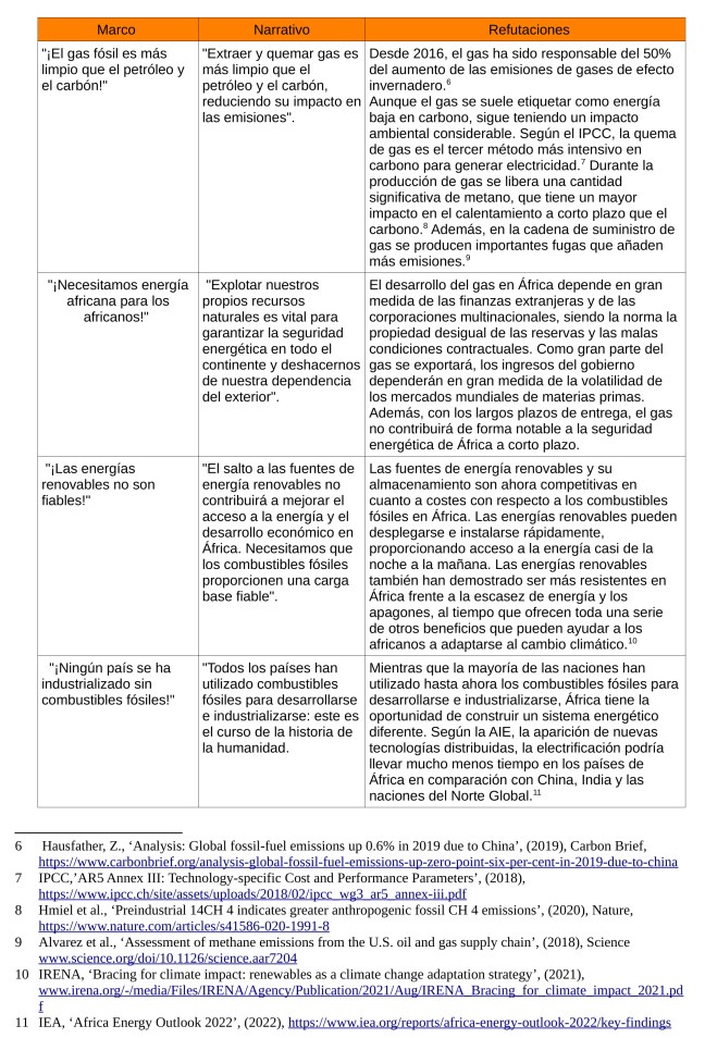 Líderes africanos y miembros de la élite están promulgando una serie de narrativas y marcos en torno al gas fósil en África que deben ser cuestionados. A continuación se presenta una recopilación de los principales marcos y narrativas que se están utilizando, y cómo se pueden cuestionar: