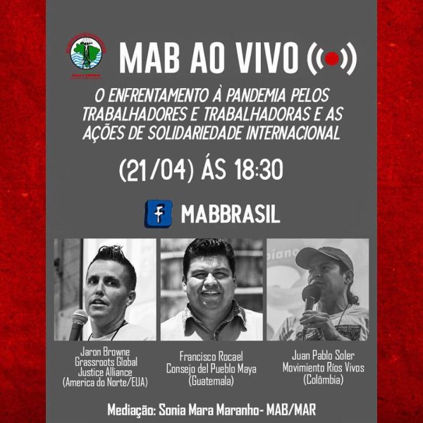 https://www.facebook.com/mabbrasil/videos/262188941621895/ Un conversatorio del MAR (Movimiento de Afectads por Represas de Latinoamérica) Con Soniamara Maranho (coordinación nacional del Movimiento de Personas Afectadas por Represas, MAB, Brasil), Víctor Bahamonde (Modatima, Chile), Francisco Rocael (Consejo de los Pueblos Mayas - CPO, Guatemala) y Jaron Browne (Alianza de Justicia Global de Base , América del Norte / EE.... Leer más →