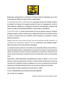 Entonces, la Comunidad Santa Marta que se ha movilizado tan contundentemente por la justicia para sus dirigentes, ante esta decisión, y la organización ADES (Asociación de Desarrollo Económico Social) a la que pertenecen ya «exigieron a la Fiscalía que se abstenga de apelar el fallo, para que la libertad definitiva de nuestros compañeros se concrete lo más pronto posible».