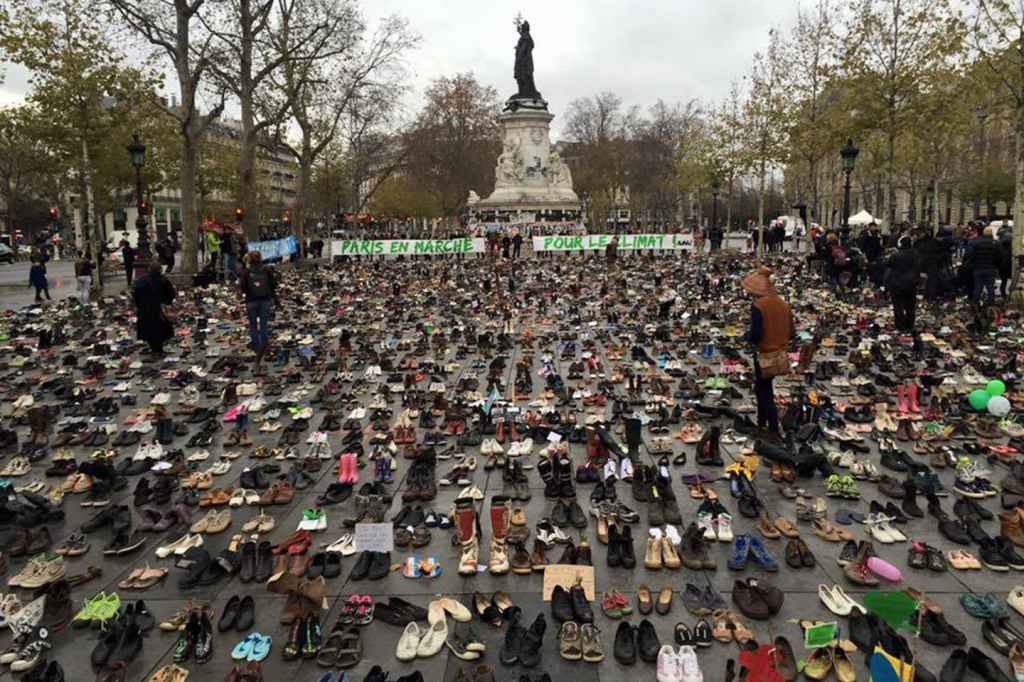 Ordu batzuk lehenago, milaka zapatek Errepublika Plaza hartu zuten, aldaketa klimatikoa salatzeko martxa horren alternatiba gisa. (Horien artean Aita Santuaren, Ban Ki-moonen eta Vivienne Westwooden zapatak daude).