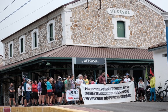 Después de sacudirse la resaca de las vivencias de ayer, la marcha en bicicleta contra los sondeos del TAV ha tomado rumbo desde Olazti hasta Alsasua. En esta localidad se ha celebrado en la estación de tren una concentración en apoyo al ferrocarril convencional y en defensa de los puestos de trabajo, junto con los representantes de los sindicatos ferroviarios. De hecho, la construcción del TAV conlleva el desmantelamiento y la destrucción de puestos de trabajo ferroviarios.
