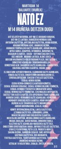 En este escenario sombrío, no solo la industria de la muerte- con más de 200 sedes en EH- se frota las manos, sino que a partir de ahora también las empresas de construcción «civil» se van a lucrar con el negocio de la guerra. Y es que, en medio de una crisis eco social global, el capitalismo trasnacional con su brazo armado al frente ha entendido que su única salida es instaurar un régimen de economía de guerra que ayude a destruir a todos sus «adversarios». Ante el imperialismo genocida de la OTAN, enemiga de la soberanía de los pueblos, AHT Gelditu! Nafarroa hace un llamamiento a participar en la manifestación que se celebrara en Iruñea el próximo sábado 14 de febrero.