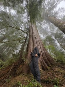 A una hora a pie detrás del bloqueo, O’Connel guía a otros cuatro protectores del bosque por una empinada colina hasta el corazón de lo que luchan por salvar. El suelo del bosque es una caótica red de vida: enormes troncos caídos, matorrales densos y musgo en todos los tonos de verde imaginables. Tras quince minutos trepando por este paisaje primigenio, encuentran su objetivo: un cedro antiguo, probablemente de 400 años, que se encuentra justo en el bloque de tala.