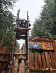 En cualquier momento, la policía puede llegar para derribar la fortaleza de madera que O’Connel y otras dos docenas de defensoras del bosque han construido a lo largo de la carretera Tree Farm License Road 44.