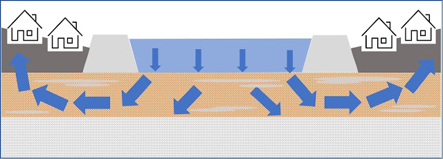 Dice Alfredo Ollero: «Esto no se debe a la supuesta elevación del cauce, sino al hecho constatado de que se inundan terrenos muy alejados del cauce por la presión del agua desde el nivel freático» (A. Ollero, 2013). Recordemos que la permeabilidad de las vegas es alta y que la permeabilidad es un parámetro que se mide en longitud/tiempo como cm/s, es decir, se trata de una velocidad. Nos enfrentamos así a uno de los diversos problemas derivados de la regulación: cuanto más lenta sea la crecida (dado que es regulada con los embalses para evitar picos, dilatando ésta en el tiempo) el proceso durará más, tal y como vimos del 9 al 19 de diciembre de 2021 desde Eugui hasta Tudela o desde Ullibarri-Gamboa hasta Tudela.