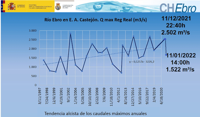 Incremento de caudales en las crecidas medidas en Castejón por la CHE desde 1997. Destacamos las últimas con apenas un mes de diferencia: las del 11 de diciembre de 2021 y las del 11 de enero de 2022 con pasos de 2.502 y 1.522 toneladas de agua por segundo respectivamente, añadidas por el autor a la gráfica de la CHE. Gestión de las avenidas en el tramo medio del Ebro. Ebro Resilience. René Gómez, 2020.