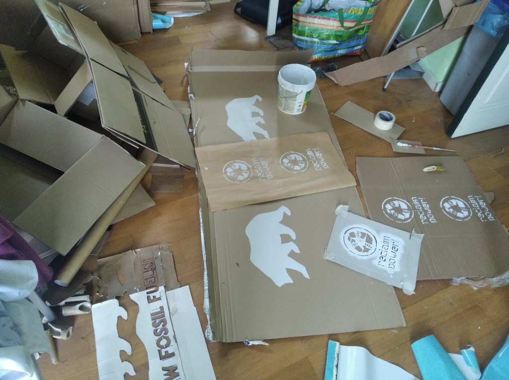 Kartoiak premiazkoak dira, manifestazioaren aurreko egunean edo gauean sortuak, eta askotan fakturari ez zaio garrantzi handirik ematen. Eskura dagoenarekin eta gastatu beharrik gabe egiten dira. Eskuragarriena? Kartoi hori pintatzeko oinarri ona da, zurruna da eta ez du dirurik balio, ekimen pertsonala delako. Gainerakoa pertsonaren araberakoa izango da. Agian pinturaren bat izango dugu hor, edo, bestela, dekorazioren bateko gainerako pinturak, horma-pinturak, edo ateak margotzekoak, eta errotuladoreak. Estali beharreko zerbait izan behar du, trazadura ikusteko modukoa.