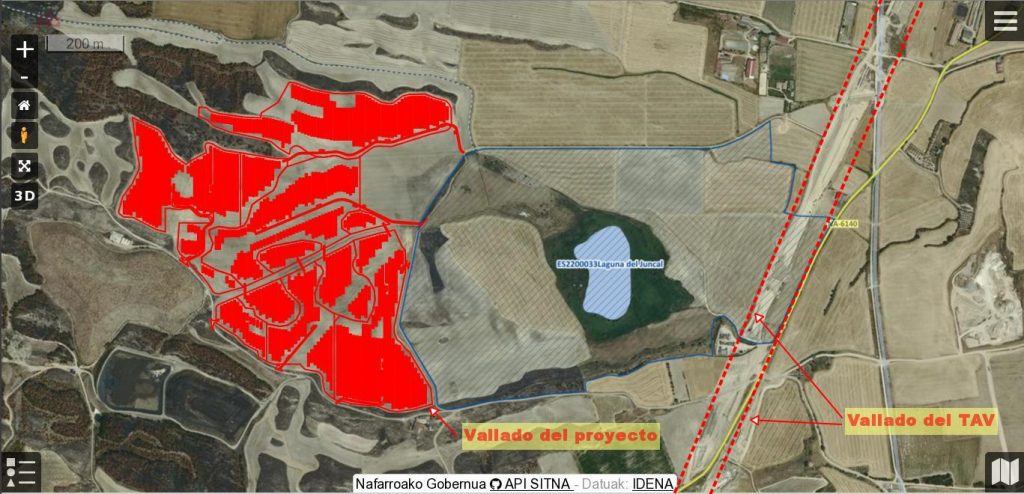 Por lo tanto, la zona protegida entorno a la laguna quedaría casi completamente rodeada por los vallados del TAV y de este proyecto de energías renovables fotovoltaicas. Lo hemos intentado plasmar en la siguiente imagen. Las placas solares ocuparían los espacios marcados en rojo a la izquierda de la imagen, y todos ellos estarían rodeados por un vallado cinegético. Y las obras de construcción del TAV ya se aprecian a la derecha, y sobre ellas se ha señalado aproximadamente el lugar donde irían sus vallas.