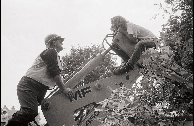 Los dieciocho meses que siguieron fueron una lucha física y emocional para las personas involucradas de ambos lados y muchas vidas cambiaron. Se forjaron lazos, se crisparon los ánimos, se aprendieron habilidades para la vida, se destrozaron esperanzas en una época de amores y risas, de abrasiones y fracturas. Mientras que algunos habitantes de Batheaston estaban comprensiblemente desesperados por una circunvalación que desviara el tráfico de la calle principal de su pueblo, otros reconocieron que sus necesidades locales estaban siendo explotadas para promover un proyecto de ingeniería civil mucho mayor: una Euroruta para conectar con la costa sur. Las comunidades y los hogares se dividieron cuando el enorme corte de la intersección para impulsar una autopista de cuatro carriles atravesó los pueblos de Bailbrook y Swainswick. A lo largo de la ruta y en la colina fue un verano de amor, un verano de tomas de excavadoras, un verano de camaradería, interminables discusiones sobre la política de transporte, la seguridad de los pícaros, los espías de los campamentos, los pozos de mierda, las casas en los árboles, los guisos veganos comunales. En Beltane, cientos de duendecillos de la protesta alimentados con hidromiel bailaron toda la noche al ritmo de la música de Space Goats, Heathens All y Theo (Seize the Day), calentados por las llamas de un enorme bull-dozer de mimbre que ardía bajo el cielo estrellado.