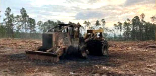 At the end of September, logging machinery was destroyed by fire in late September in Camden County, Georgia, USA. Since 2000, the state of Georgia has suffered 36% deforestation of its forests, equivalent to and 1.49 GTm of CO₂e emissions.