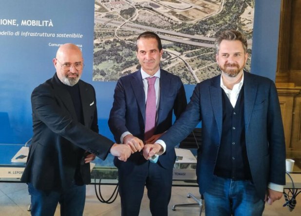 Golpe al medio ambiente. De derecha a izquierda, el alcalde Matteo Lepore, el director general de Autostrade per l’Italia, Roberto Tommasi, y el presidente regional, Stefano Bonaccini.