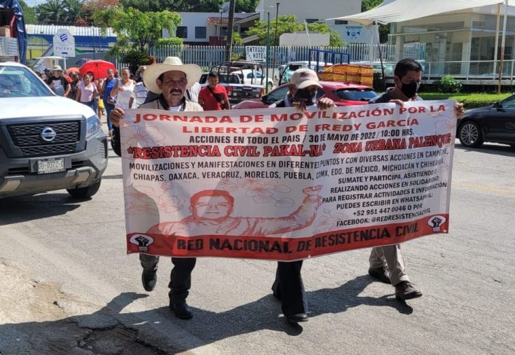 Yesterday, May 30, 2022, the National Network of Civil Resistance (RNRC)1 and all the organizations that make it up, and others that have joined it, mobilized throughout Mexico on the day of the resolutory hearing of their comrade Fredy García Ramírez. They have demanded his freedom after two and a half years of unjust imprisonment. Fredy is a Defender of Human Rights and Territories and spokesperson for CODEDI (Committee for the Defense of Indigenous Rights) of Oaxaca, part of RNRC. Mobilizations have taken place in Campeche, Chiapas, Oaxaca, Veracruz, Morelos, Puebla, CDMX, State of Mexico, Michoacán and Chihuahua.